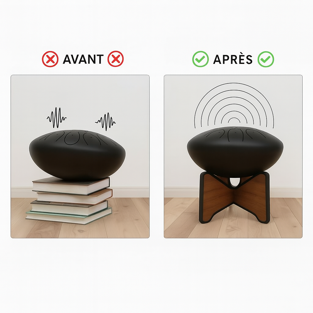 Imaginez un coin de votre maison dédié à votre passion. Un espace où votre tongue drum trône fièrement, toujours prêt, toujours accueillant. Plus besoin de le ranger : il devient élément de décor, invitation permanente à la créativité. Le Support Élégance Bois transforme votre instrument en pièce maîtresse de votre intérieur. Parce que la beauté inspire, et l'inspiration crée.